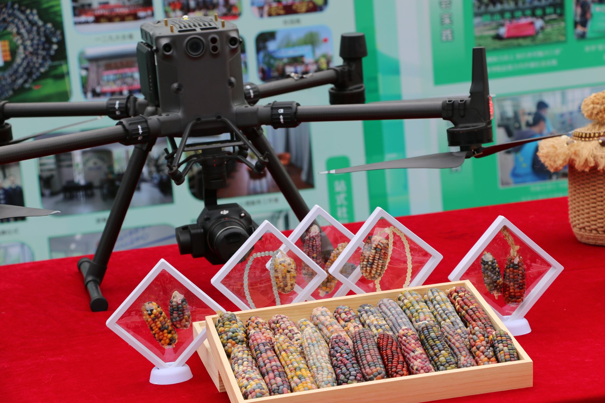 新生报到处采用特色产品展示区与桁架组合的方式,周边以农学院特色五谷花束点缀,选取色泽饱满的稻、黍、稷、麦、菽等作物,既具艺术观赏性,又能让新生沉浸式感受农耕气息。展示桌上,农学院特色科研成果、文创产品有序陈列,新生踏入场地,便能直观感受专业魅力与文化底蕴,体悟“厚德尚农,崇学养民”精神,稳稳迈出充满希望的农学新征程第一步。