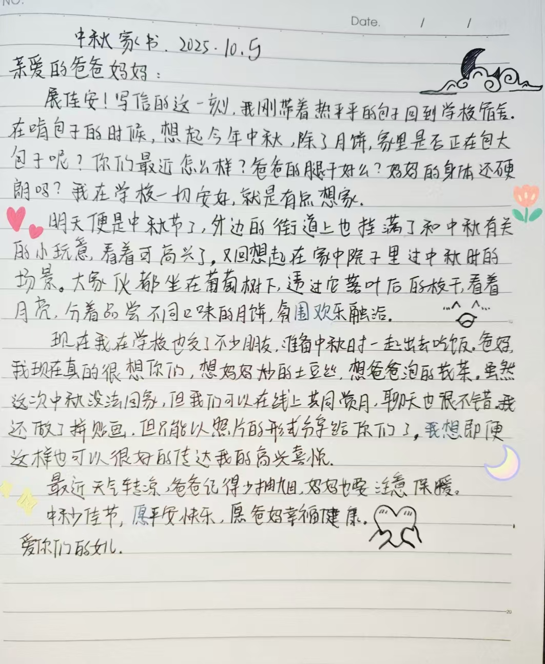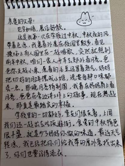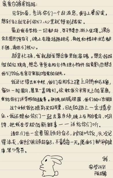 活动期间,同学们以笔为媒,将对家人的牵挂落于纸上。有的同学在信中细数校园里的成长点滴,分享专业课实验的收获与社团活动的乐趣;有的同学回忆与家人围坐赏月、分食月饼的温馨往事,字里行间满是思念;还有同学在信末绘制玉兔、月亮等中秋图案,搭配与月饼、灯笼的合影,让家书更添节日氛围。每一封手写家书都字迹工整、情感饱满,没有华丽辞藻,却用最朴素的语言诠释了“家书抵万金”的深意,展现了农科学子细腻温暖的内心世界。