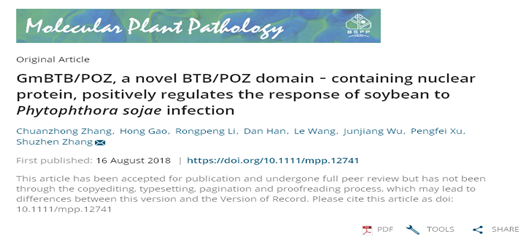 2018年8月16日,国际知名学术期刊Molecular Plant Pathology(一区,IF=4.188)在线发表了大豆生物学教育部重点实验室张淑珍教授团队题为“GmBTB/POZ, a novel BTB/POZ domain‐containing nuclear protein, positively regulates the response of soybean to Phytophthora sojae infection”的研究论文。