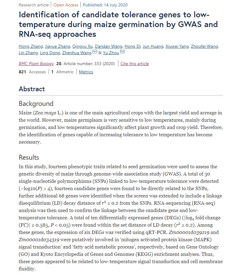 近期,国际学术期刊《BMC Plant Biology》(中科院2区,IF=3.497)在线发表了东北农业大学玉米遗传育种团队题为“Identification of candidate tolerance genes tolow-temperature during maize germination by GWAS and RNA-seq approaches”的研究论文。