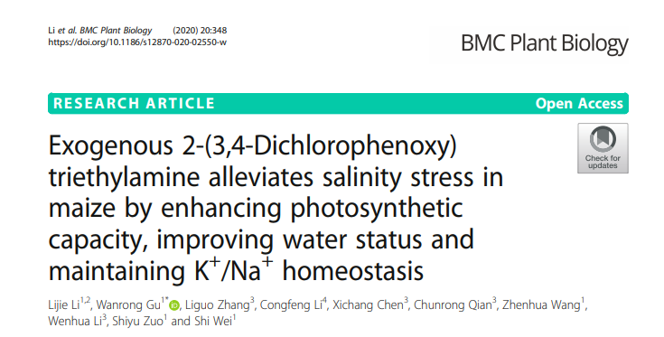 土壤盐渍化是限制农业发展最严重的不利环境因素之一。近期,东北农业大学玉米栽培生理生态团队顾万荣副研究员和李晶副教授课题组完成的题为Exogenous 2-(3,4-Dichlorophenoxy) triethylamine alleviates salinity stress in maize by enhancing photosynthetic capacity, improving water status and maintaining K+/Na+ homeostasis”的研究论文在BMC Plant Biology 2020年第20卷第1期正式发表(二区,影响因子:3.49),研究为提升黑龙江春玉米区盐碱地玉米生产能力提供新的技术途径和实验依据。