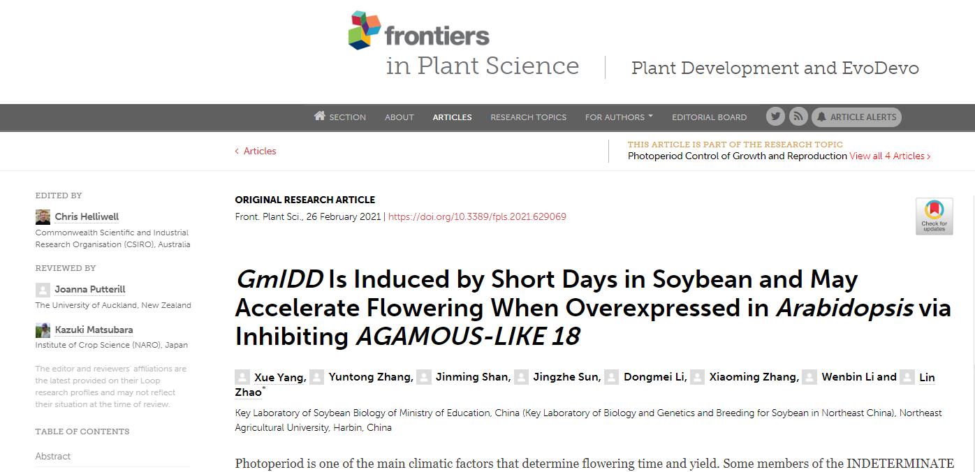 近期,国际学术期刊《Frontiers in Plant Science》(中科院2区,IF=4.402)在线发表了(东北农业大学大豆生物学教育部重点实验室赵琳研究员团队)的题为(“GmIDD Is Induced by Short Days in Soybean and May Accelerate Flowering When Overexpressed in Arabidopsis via Inhibiting AGAMOUS-LIKE 18”)的研究论文。
