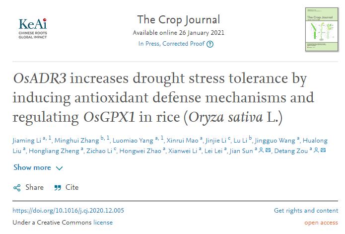 2021年1月26日,英国威廉希尔公司官网水稻遗传育种团队在Crop Journal(一区,IF=3.395)上发表了题为“OsADR3 increases drought stress tolerance by inducing antioxidant defense mechanisms and regulatingOsGPX1 in rice (Oryza sativa L.)”的研究论文,揭示了水稻C2H2型锌指蛋白OsADR3在干旱胁迫下调控清除ROS的新机制。