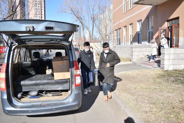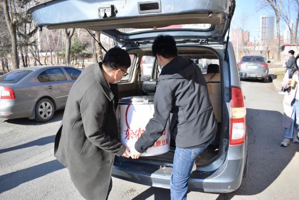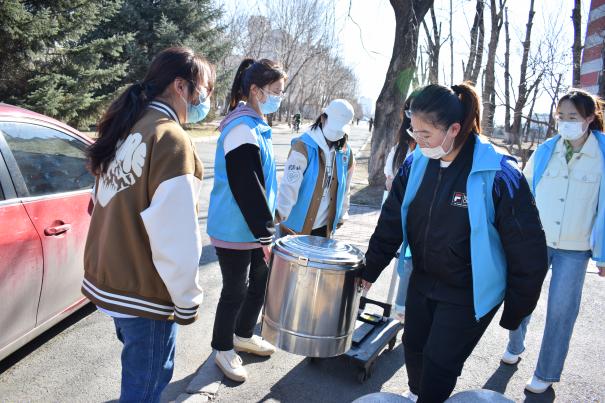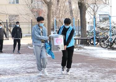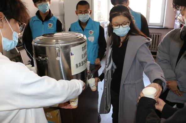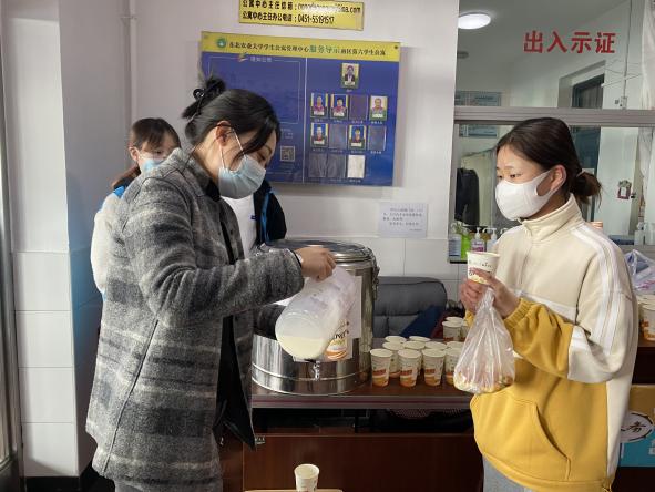 弥散在哈尔滨清晨的寒气还未散去,辅导员老师们与学生志愿者早已集结完毕,有序进行豆浆的装车和运送,趁热送至学生宿舍楼下。在豆浆发放过程中,学生错峰下楼,秩序井然,既有效避免人群聚集,又能够确保每名同学都能喝上学院的爱心豆浆。