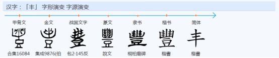 字形演变:象形字,甲骨文、金文、战国文字的形状,都是下像“豆”,上像容器中有所盛。“豆”原为古代用来装肉的器皿,也是盛肉祭祀的礼器,后“豆”也盛装其他祭品。篆文从“豆”,上像盛装丰满,表示祭祀的礼器很大,祭品很丰富。在六书中属于合体象形。《说文》另收有古文,像“豆”上有丰盛祭品。隶书、楷书都从篆文来。故「豐」本是盛有贵重物品的礼器。这由「豊」字可以得到证明。古文「豐与“豊」是同一个字